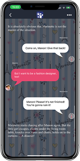 Read the classic medium of text in bold, italic, left side, right side or aligned also in a „new” outfit in the form speech bubbles. Pictures can be inserted in the continuous text, the cell phone can vibrate or the screen can be darkened. Also possible as read aloud function.